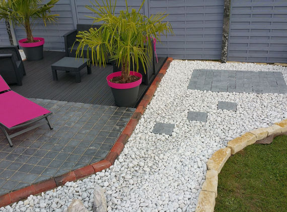 Dépose et repose de pavés autobloquants, réalisation d'une terrasse en béton désactivé avec joint en brique de pavage.